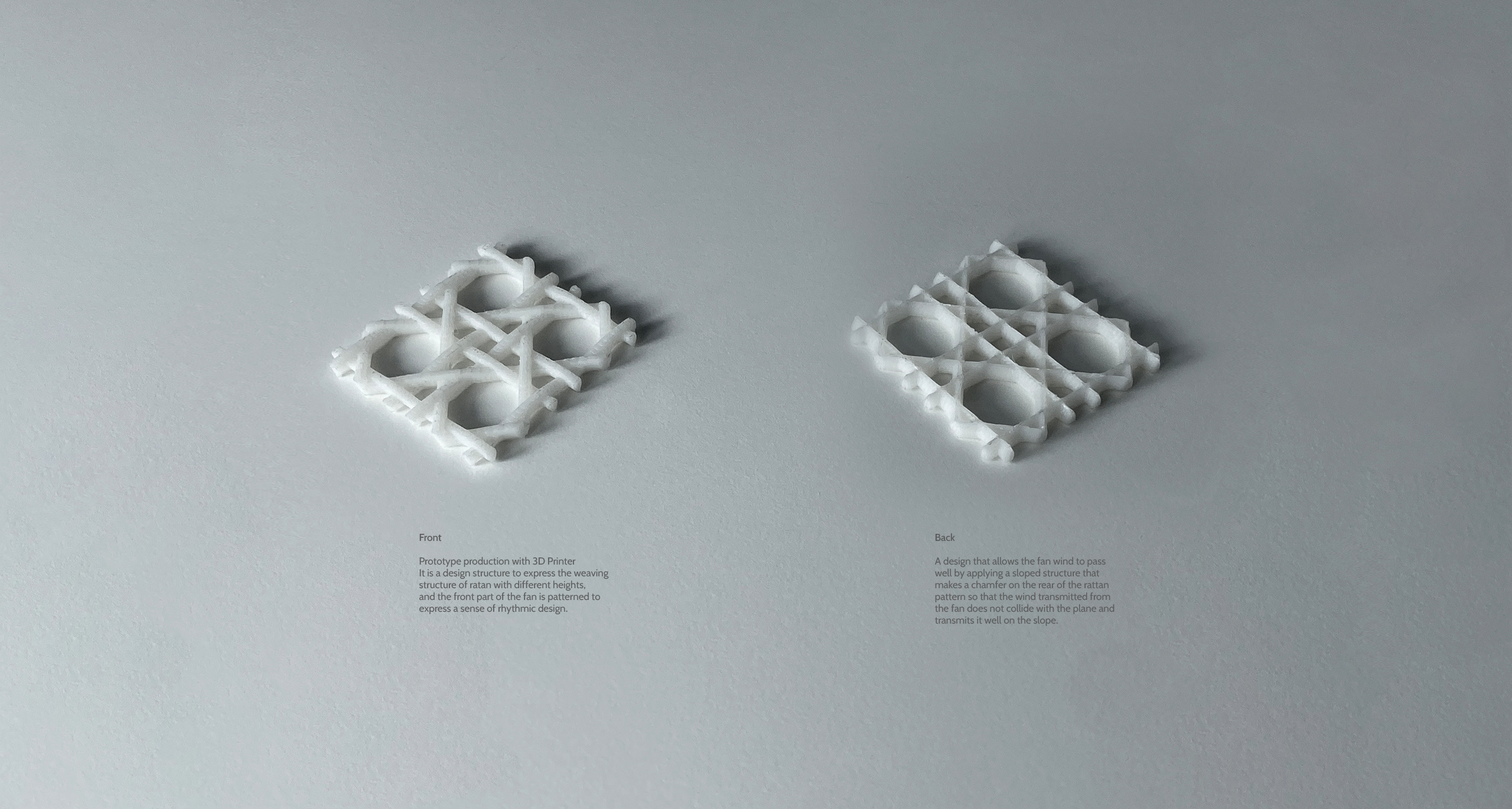 선풍기 케이스의 전면부는 라탄 특유의 꼬임을 표현해 주었고, 뒷면부는 바람의 흐름을 방해하지 않도록 예각의 면을 만들어 주었습니다.